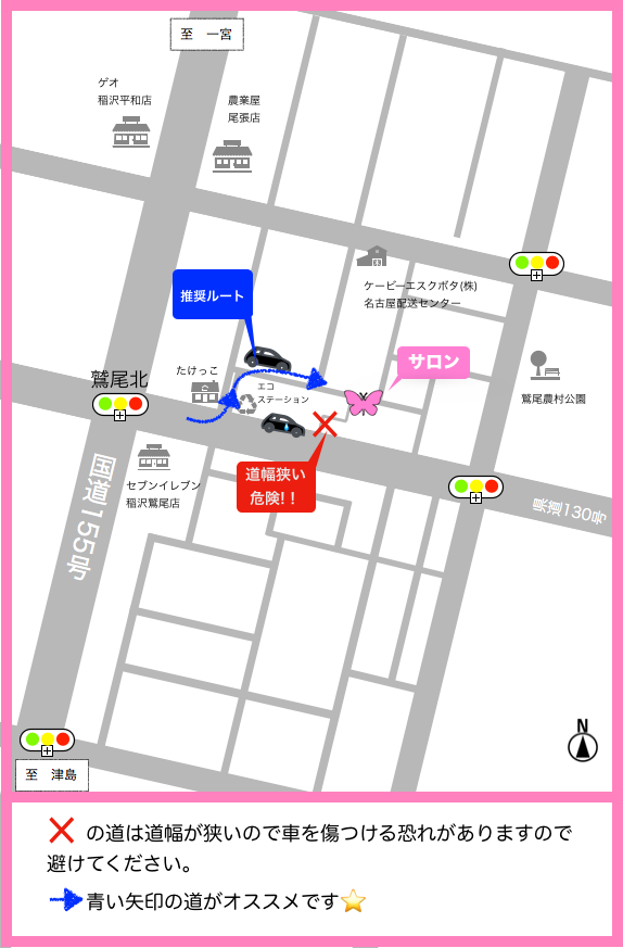 ご来店の際は細い道がありますので気をつけてお越しください。